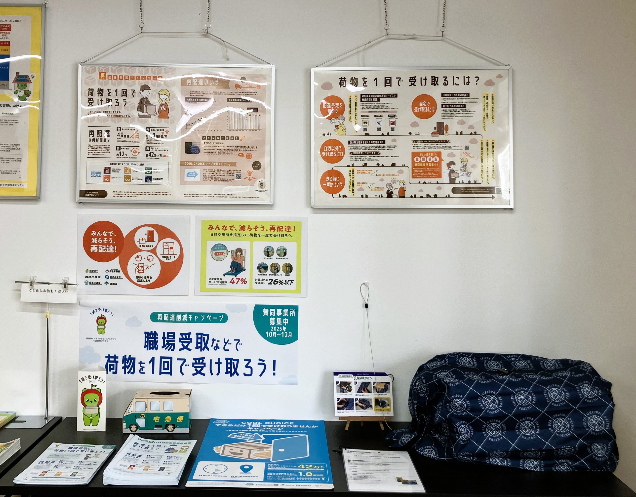 ゼロカーボン社会共創プラットフォーム「くらしふと信州」では、参加事業所募集中の「再配達削減キャンペーン」に関する展示を行っています。