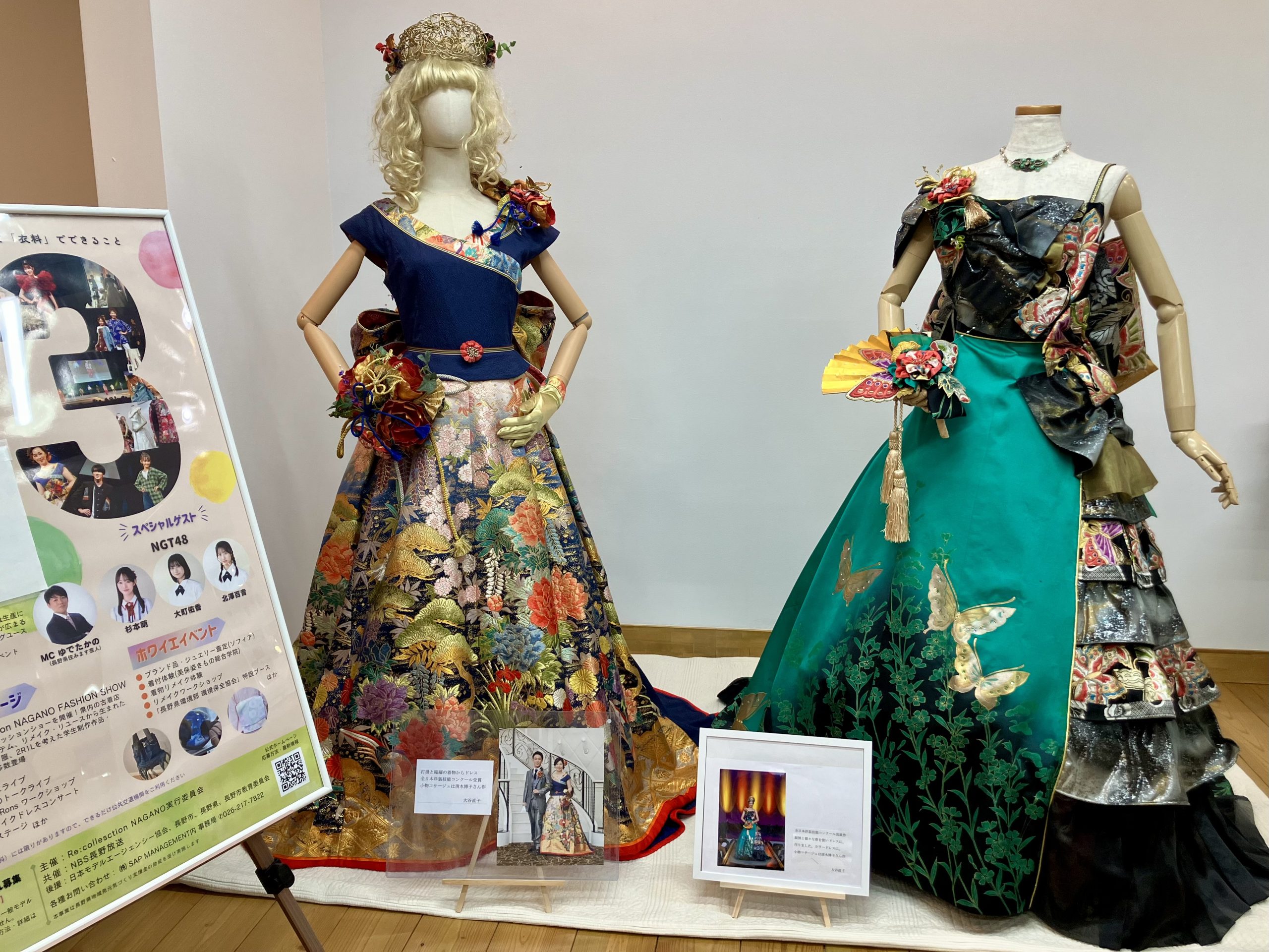 ゼロカーボン社会共創プラットフォーム「くらしふと信州」では、「Re:collection NAGANO 3rd」(2025/11/30 @長野市芸術館)に出展された、着物などをリメイクした衣裳2作品を展示中(~12月末)【写真左】。