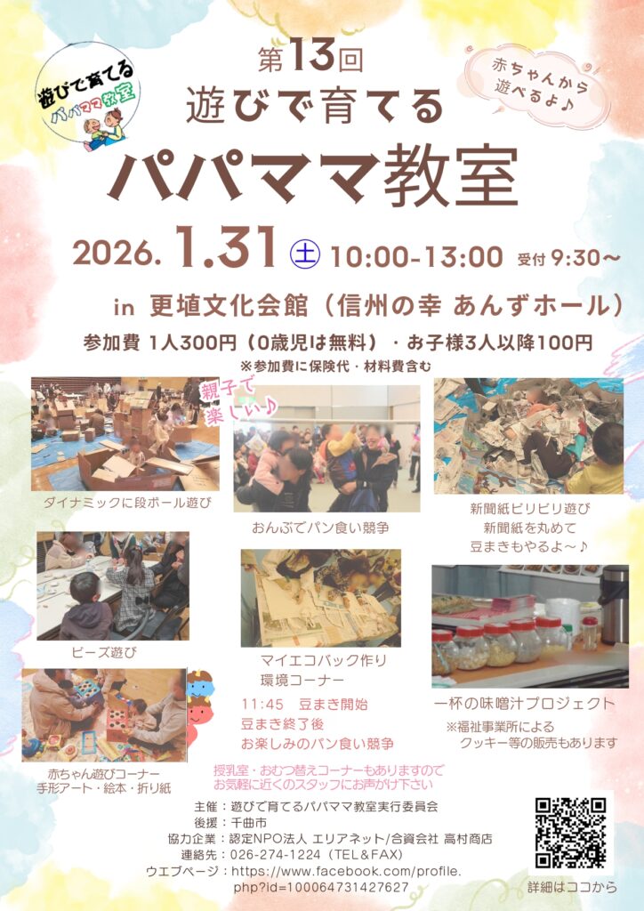 - 内容 おんぶでパン食い競争、段ボール遊び、ビーズ遊び、新聞紙ビリビリ遊びと豆まき、エコバッグ作り、赤ちゃん遊びコーナー、一杯の味噌汁プロジェクト等、盛りだくさん。