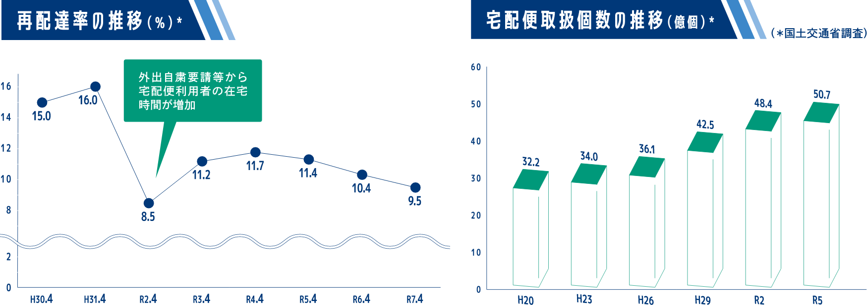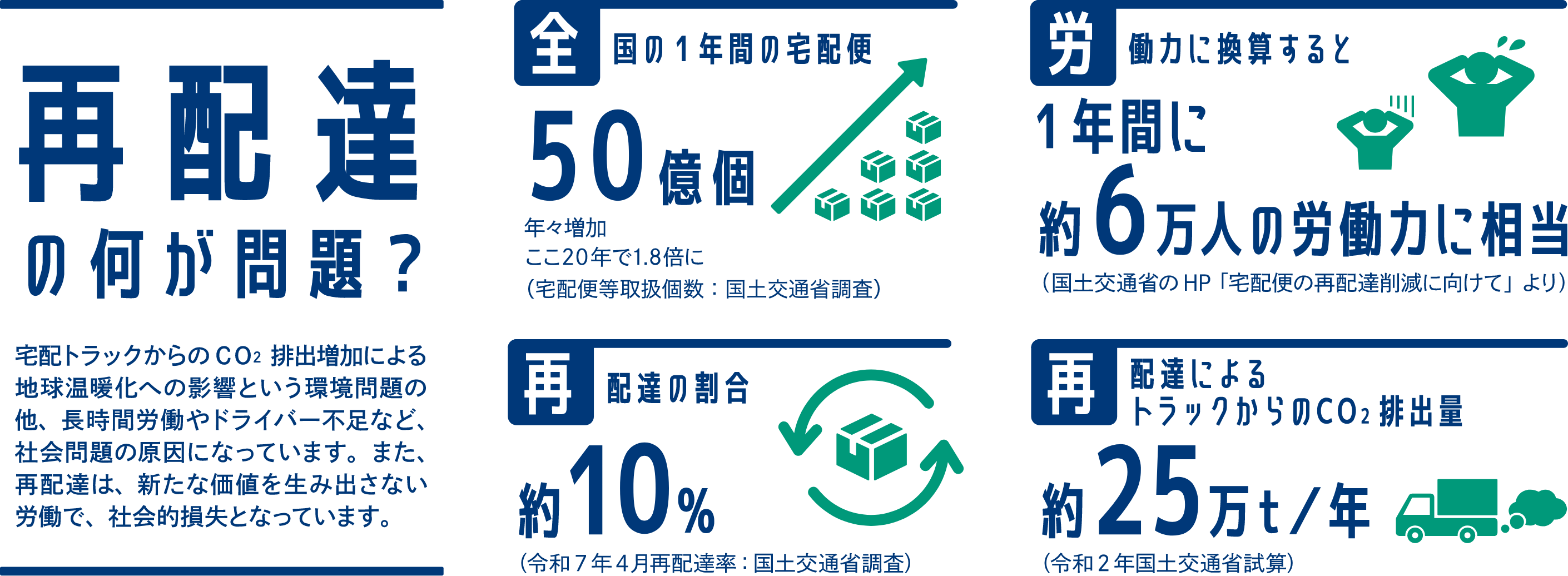 近年、多様化するライフスタイルとともに電子商取引(EC)が急速に拡大し、宅配便の取り扱い個数が増加している一方、宅配便の再配達は、地球温暖化につながる温室効果ガスであるCO2の排出量の増加やドライバー不足を深刻化させるなど、重大な社会問題、環境問題の一つとなっています。このような状況を改善するために、皆様のご理解とご協力をお願いします。